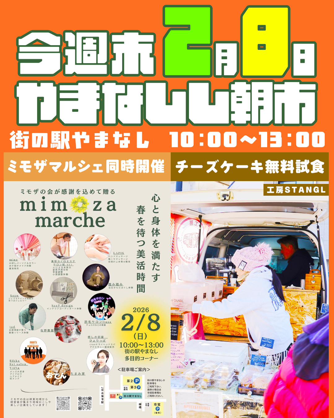 2月の目玉は前回に引き続きミモザマルシェコラボ、そして工房STANGLさんのチーズケーキ無料試食会です🍰✨